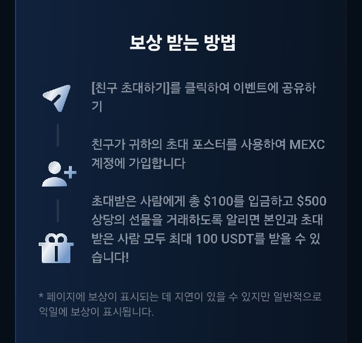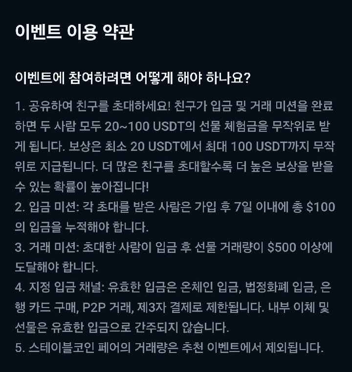 3) 초대받은 사람에게 총 $100를 입금하고 거래하면 초대한 사람과 초대받은 사람 모두 최대 100 USDT를 받을 수 있다.