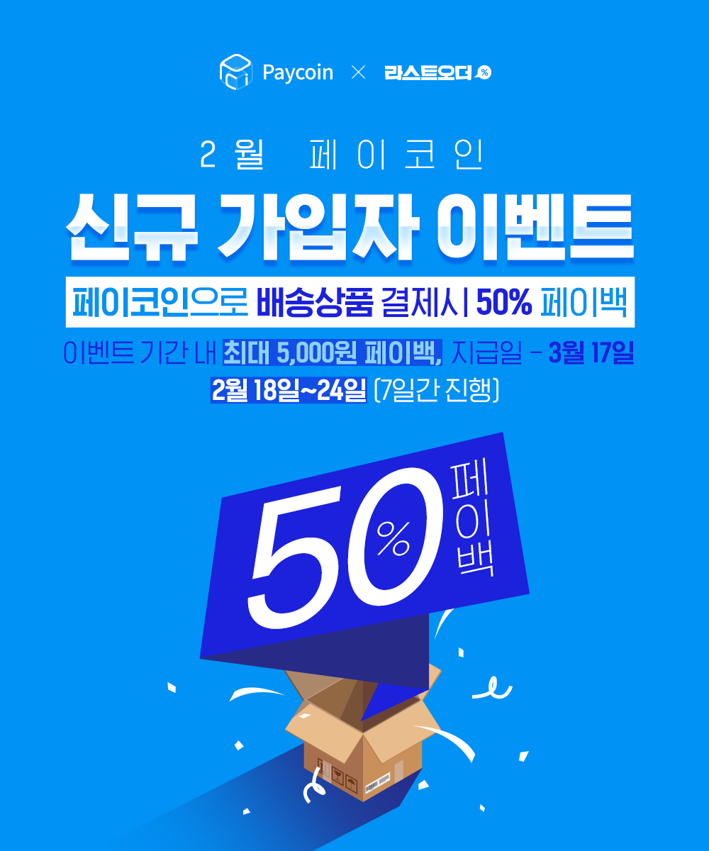 - 2월 페이코인 신규가입자, 페이코인으로 배송상품 결제시 50% 페이백