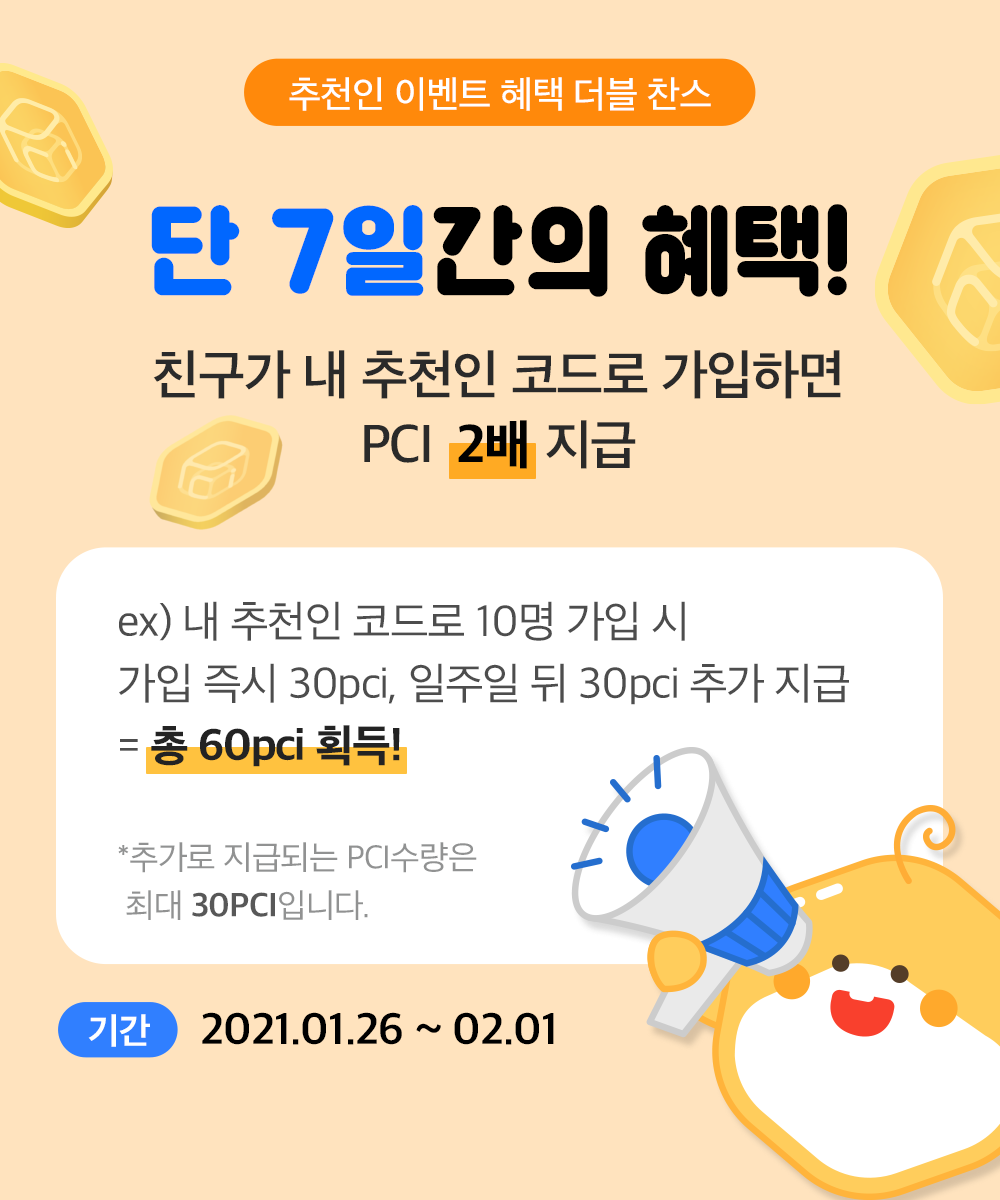 ex) 내 추천인 코드로 10명 가입하면 가입 즉시 30pci +추가지급 70pci = 총 100pci 획득!