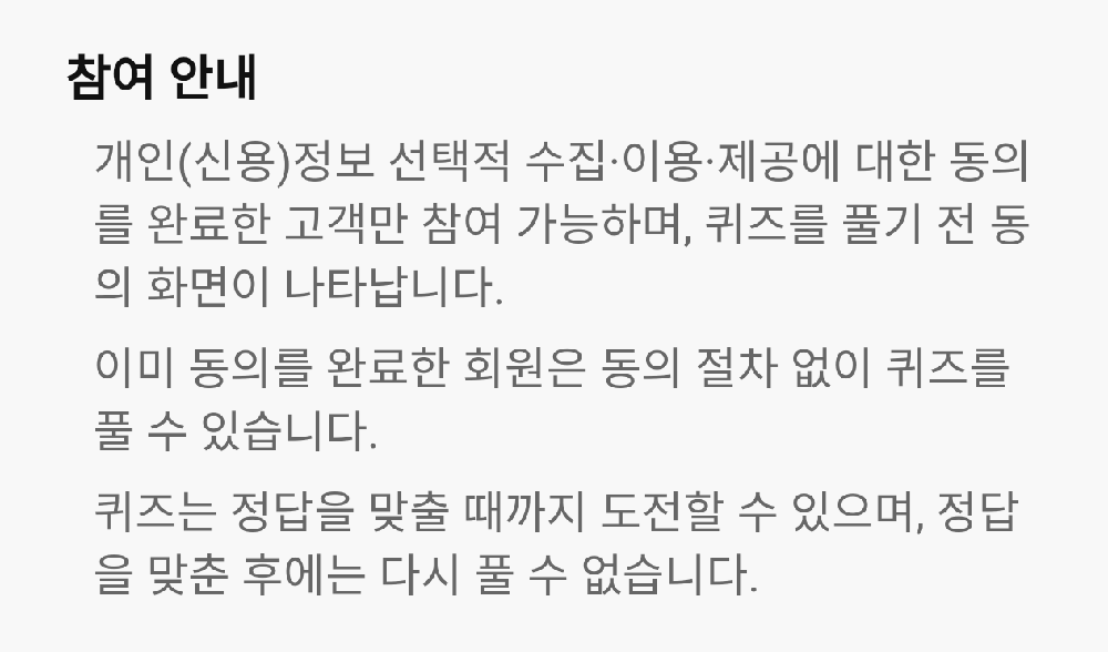 - 참여 안내 개인(신용)정보 선택적 수집·이용·제공에 대한 동의를 완료한 고객만 참여 가능하며, 퀴즈를 풀기 전 동의 화면이 나타난다.