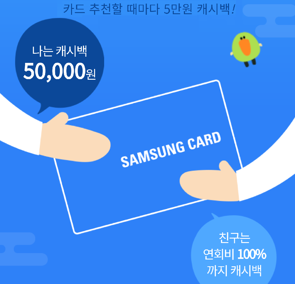 - 삼성카드 홈페이지에서 추천을 통해 온라인으로 카드를 신청, 발급 후 삼성카드 앱에 해당 카드를 등록 및 앱카드 결제 시 연회비 100% 캐시백 제공