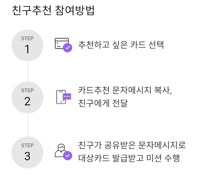- 추천받는 친구분이 가족카드를 가지고 있거나 친구추천으로 지급이력이 있는 경우는 제외되며, 체크카드/법인카드만 가지고 있는 경우에는 캐시백이 제공된다.