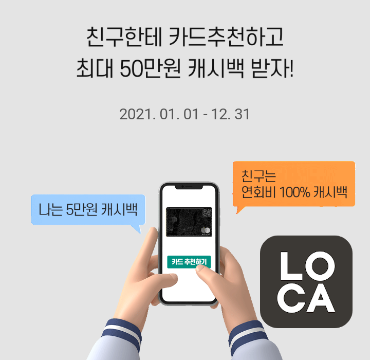- 추천혜택으로 제공되는 캐시백은 운영기간(2021.01.01~12.31)중 최대 10명까지 가능하며, 초과발급건에 대해서는 캐시백이 제공되지 않는다.