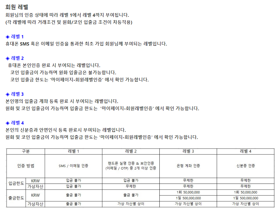 회원 가입하면 인증 상태에 따라 레벨 1에서 레벨 4까지 부여되고, 각 레벨에 따라 거래조건 및 원화/코인 입출금 조건이 차등적용된다.