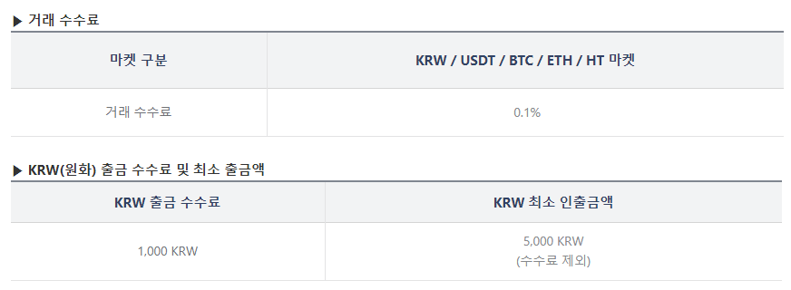 - KRW, USDT, BTC, ETH, HT 마켓 거래 수수료 : 0.1%