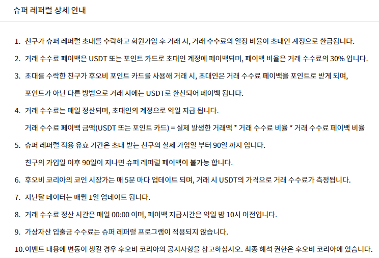 - 후오비로 친구 초대하고, 친구의 거래 수수료를 페이백 받을 수 있다. 적용 유효 기간은 초대 받는 친구의 실제 가입일부터 90일까지 페이백을 받을 수 있다.