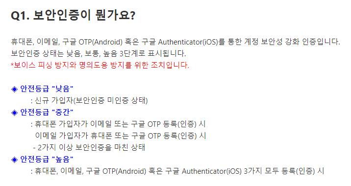 - 휴대폰, 이메일, 구글 OTP(Android) 혹은 구글 Authenticator(iOS)를 통한 계정 보안성 강화 인증이고, 보이스 피싱 방지와 명의도용 방지를 위한 것이다. 보안인증 상태는 낮음, 보통, 높음 3단계로 표시된다.