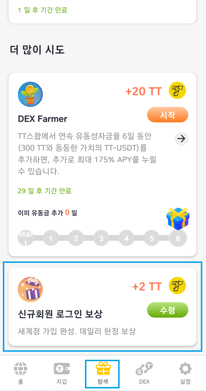 - 탐색으로 이동, 아래쪽에 "신규회원 로그인 보상" 에서 2TT 받기