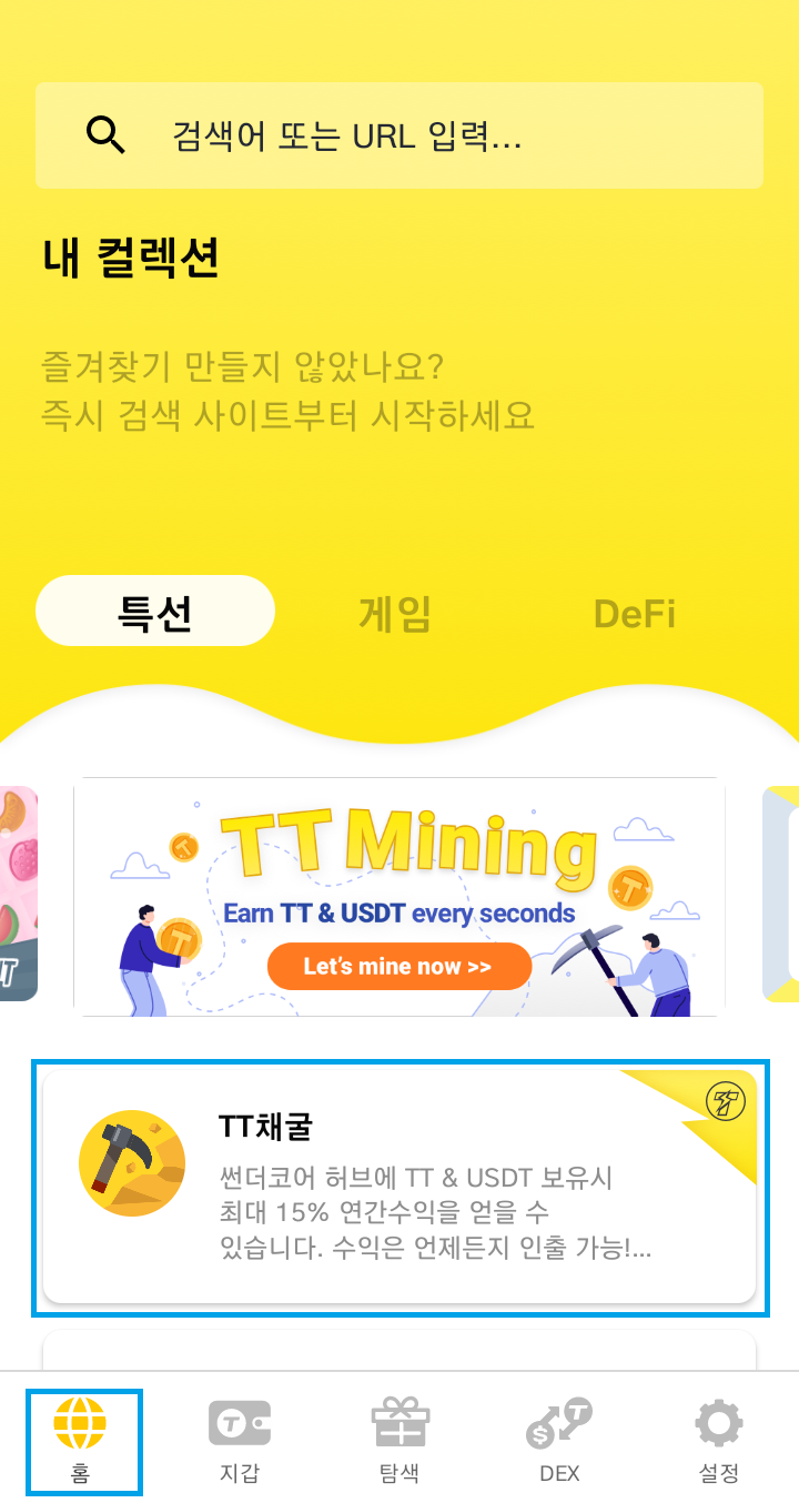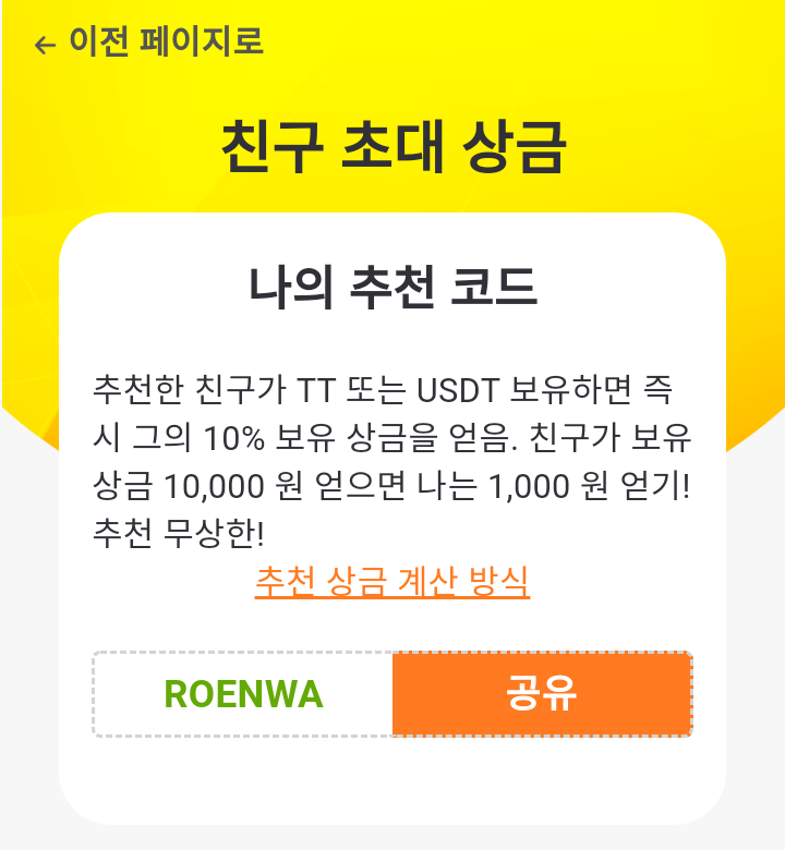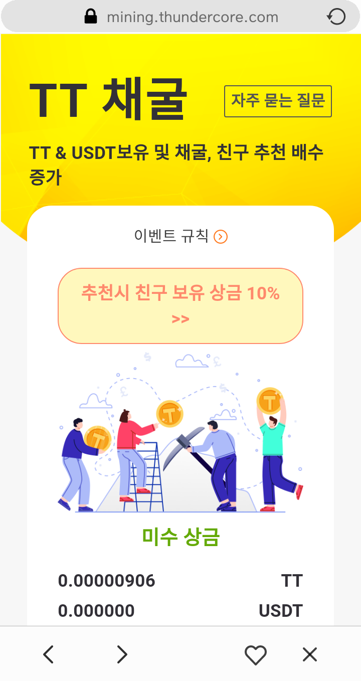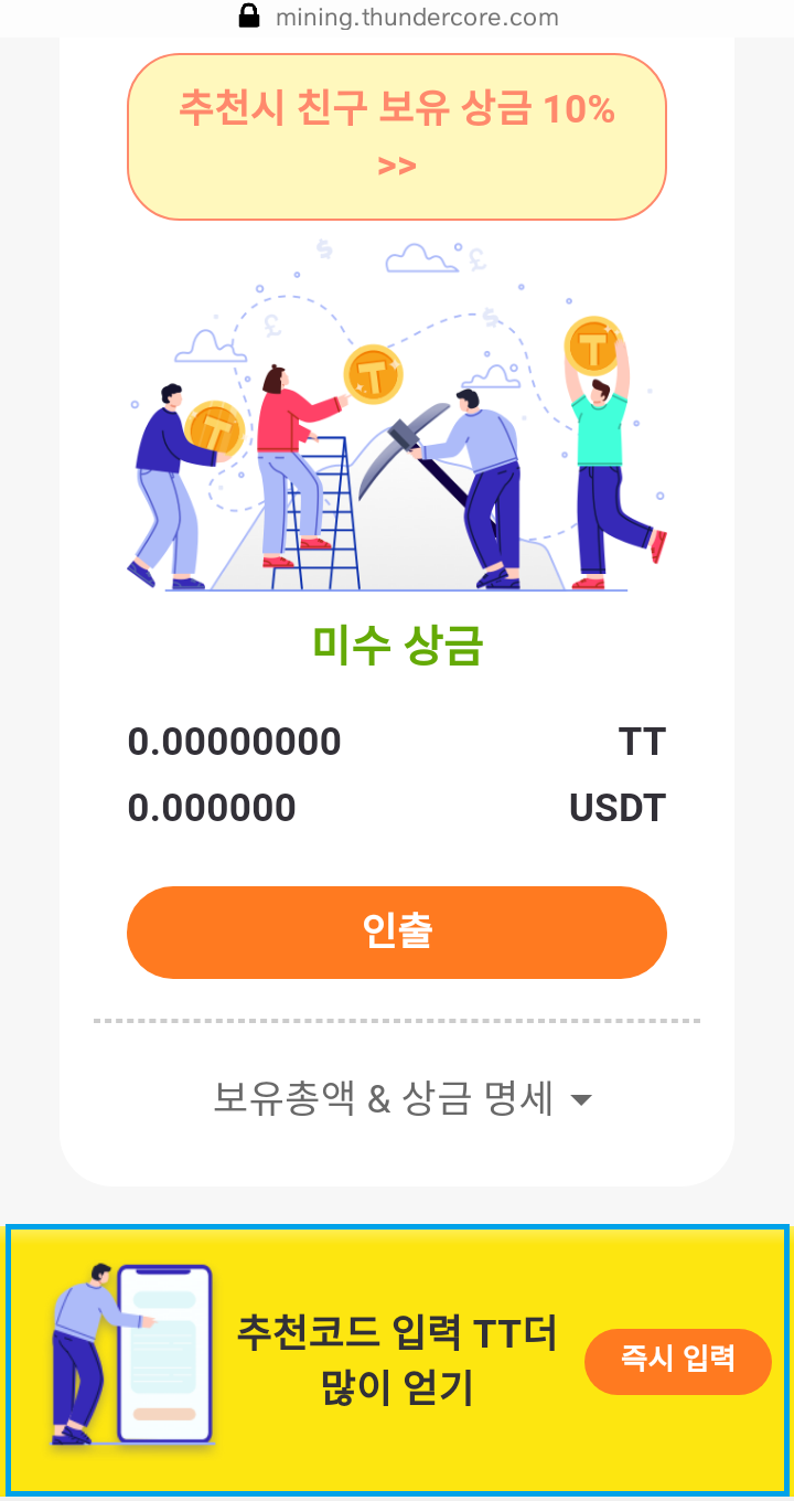 - 홈>TT채굴 이동 : TT채굴 화면 아래쪽에 추천코드 입력, 추천코드 입력시 채굴속도 1% 증가