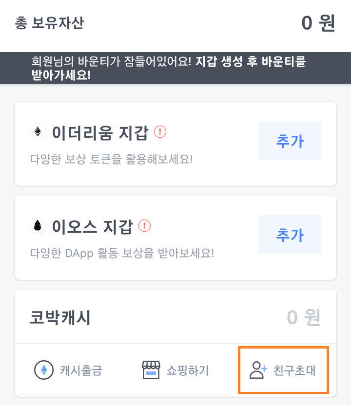 3) 마이페이지 > 코박캐시 > 친구초대 이동