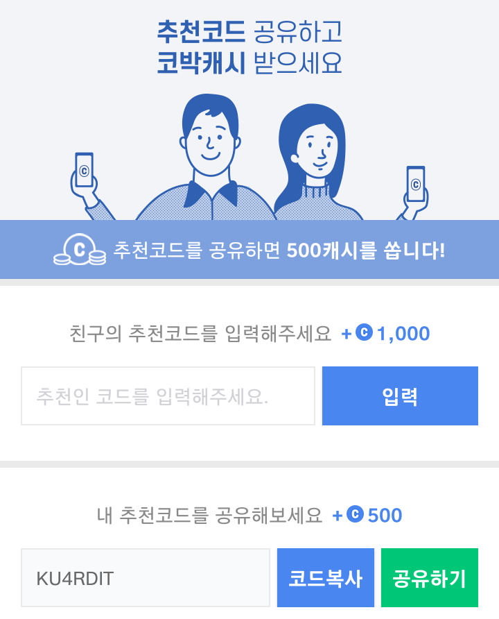 4) 추천 코드( KU4RDIT ) 입력하여 1000캐시 적립
