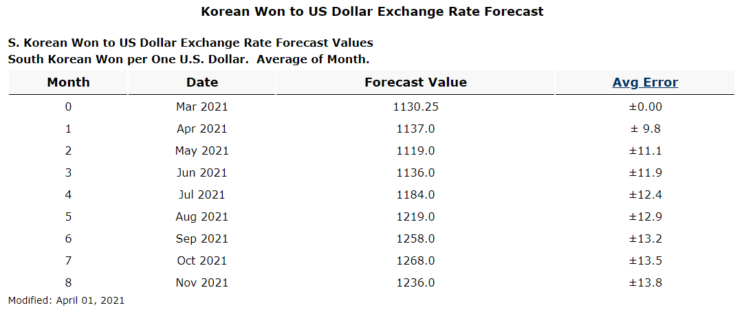 ▲ 2021년 3월 ~ 2021년 11월 원화와 달러화의 환율 예상금액(2021.4.1)