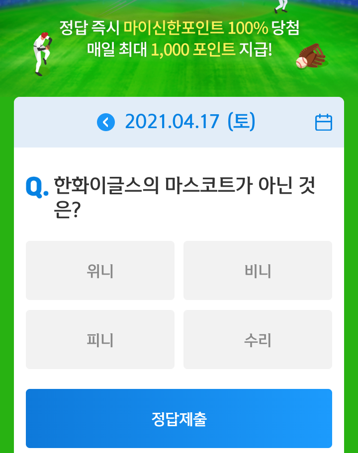 매일 야구상식 쏠퀴즈 풀고 마이신한포인트 최대 1000포인트 받아가세요.