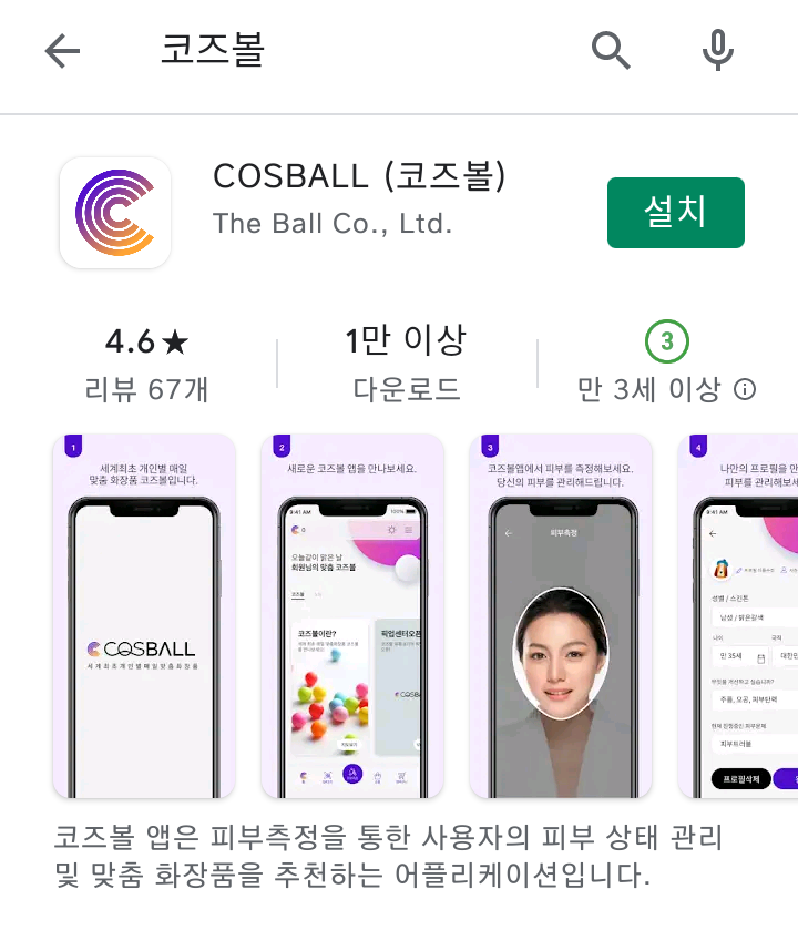 코즈볼(COSBALL) 피부측정을 통한 사용자의 피부 상태 점검 및 맞춤 화장품 추천하는 앱이다.