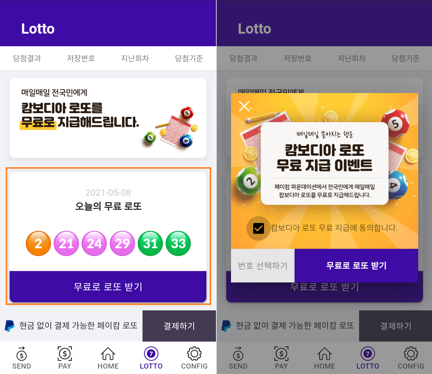 4) 화면 하단 LOTTO 클릭 > 무료 로또 받기