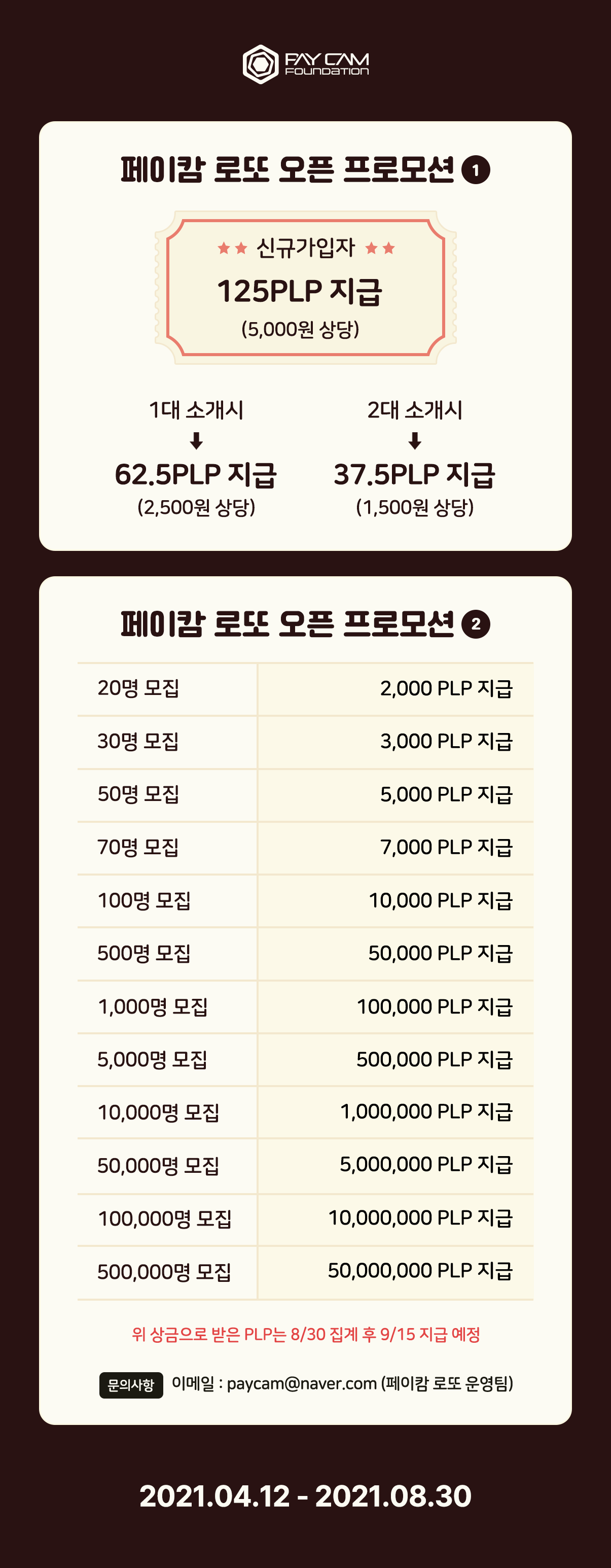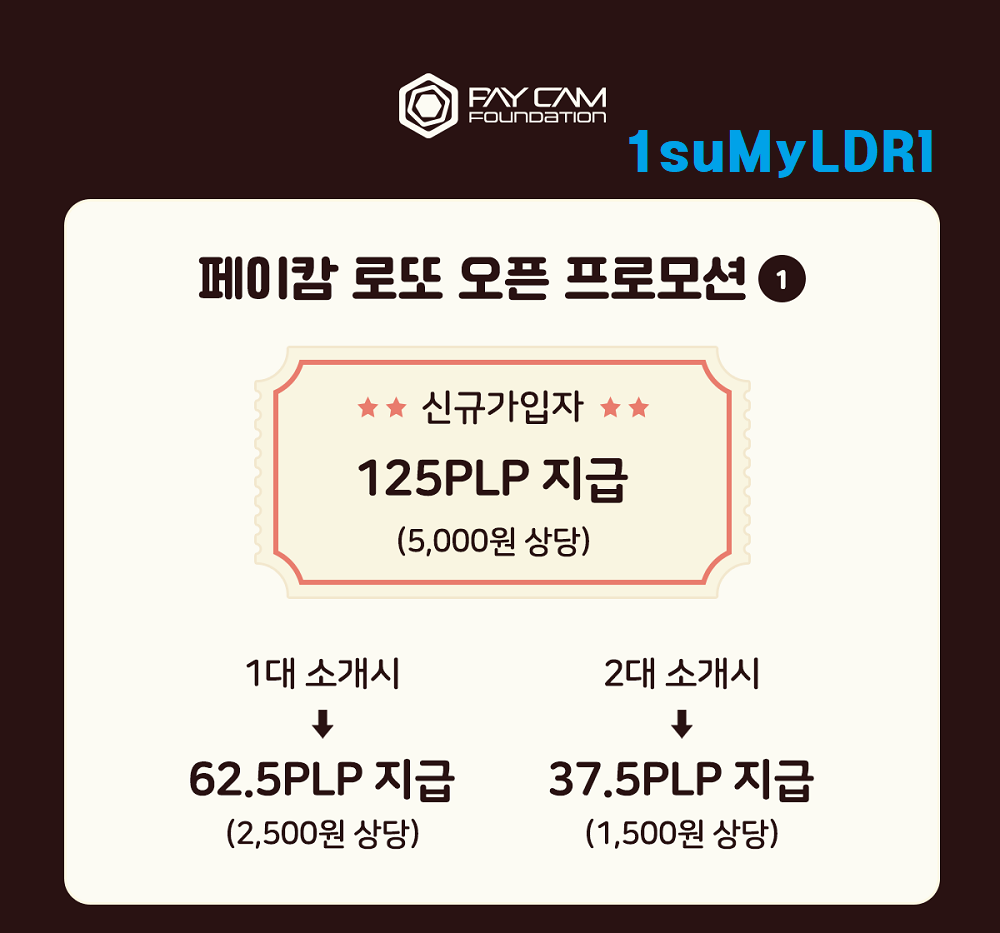 현재 페이캄에서 오픈 이벤트로 4월 20부터 ~ 8월 30일까지 2가지 프모로션을 진행하고 있다. 첫번째는 추천 이벤트로 신규가입자에게 125PLP(5천원 상당)가 지급되고, 추천한 사람에게도 코인이 지급된다. 1대 소개시에는 62.5PLP(2500원 상당), 2대 소개시에는 37.5PLP(1500원 상당)가 지급된다. 두번째는 추천 모집 인원에 따라 보상으로 PLP가 추가로 차등 지급되는데, 1대 가입자만 카운팅된다.
