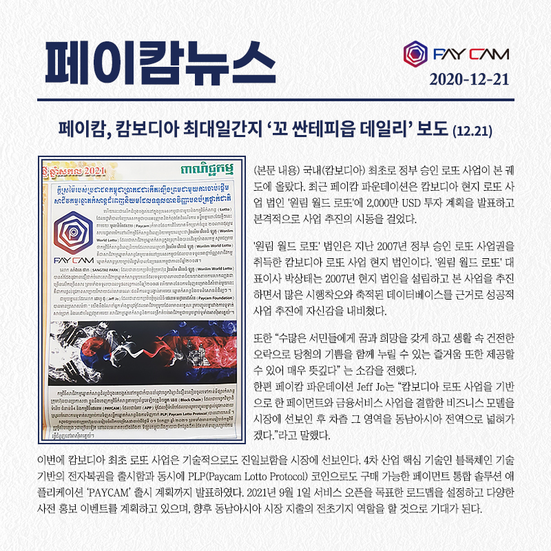 - 페이캄(Pay CAM)은 캄보디아 정부로부터 공식 허가받은 로또 사업을 기반으로 한 디지털 자산 프로젝트로 2040년까지 사업권을 보장받았다고 한다.