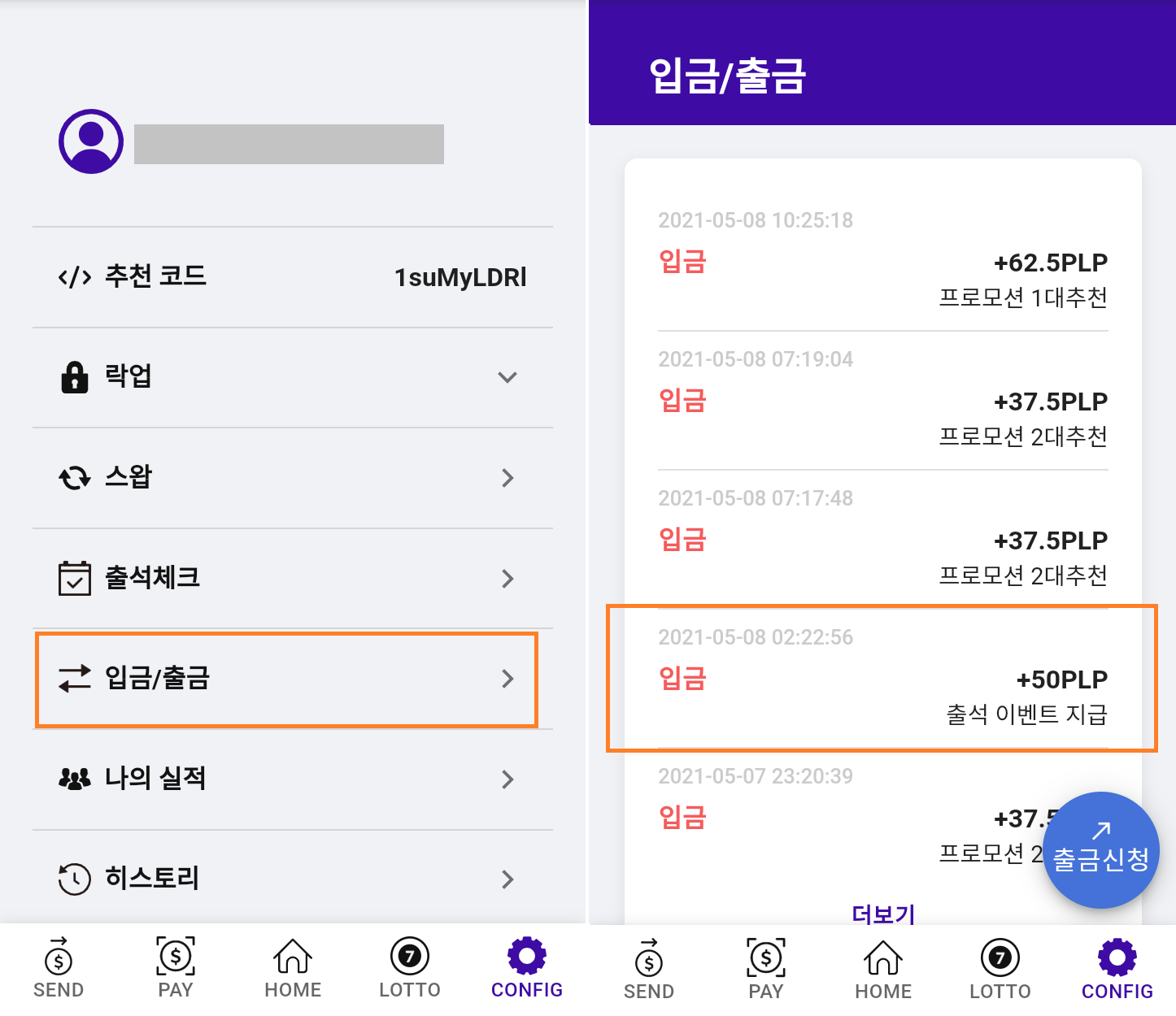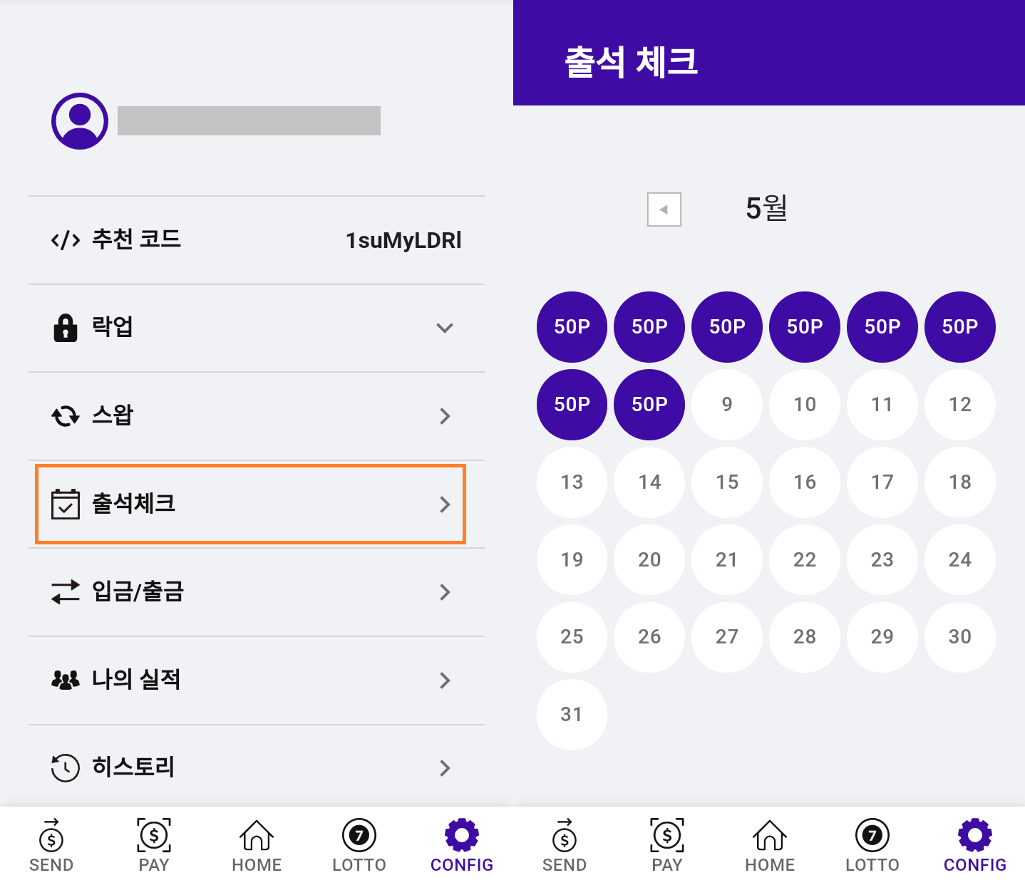 3) 화면 하단 우측 CONFIG 클릭 > 출석체크 50 PLP 적립