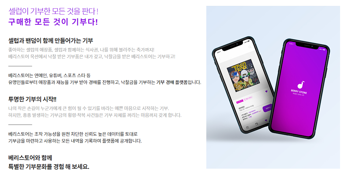 베리스토어(Berry Store)는 베리스토어는 연예인, 유튜버, 스포츠 스타 등 유명인의 애장품과 재능을 기부 받아 경매를 진행하고, 낙찰금을 기부하는 기부 경매 플랫폼이다.