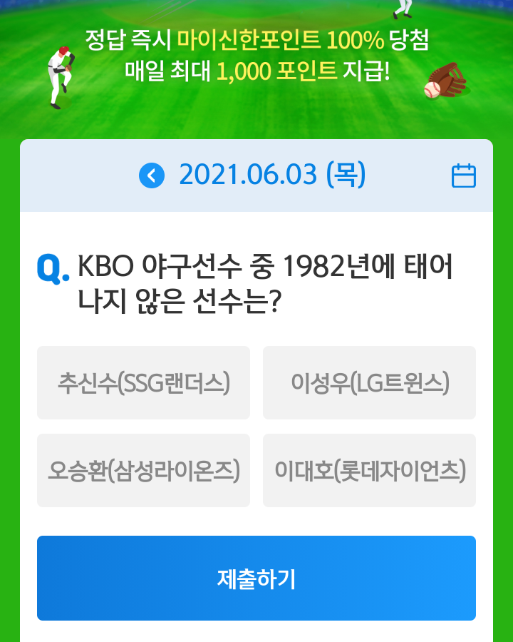 매일 야구상식 쏠퀴즈 풀고 마이신한포인트 최대 1000포인트 받아가세요.