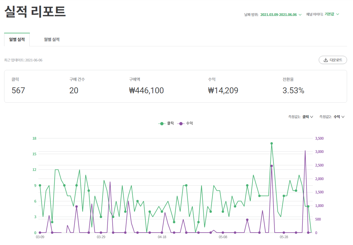 - 쿠팡 파트너스 수익확인은 매일 오후 12시~2시 사이에 쿠팡 파트너스 아이디로 로그인 하면 확인할 수 있다.