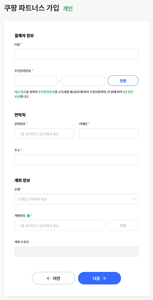 - 쿠팡파트너스로 수익이 발생할 때 수익금 정산 받을 계좌 정보 입력한다.