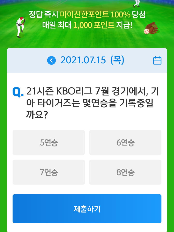 신한쏠, 야구상식 쏠퀴즈(21.07.15), 퀴즈정답, 7월 경기에서 기아 타이거즈는 몇연승