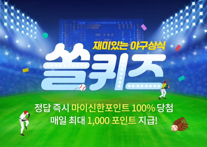 매일 야구상식 쏠퀴즈 풀고 마이신한포인트 최대 1000포인트 받아가세요.