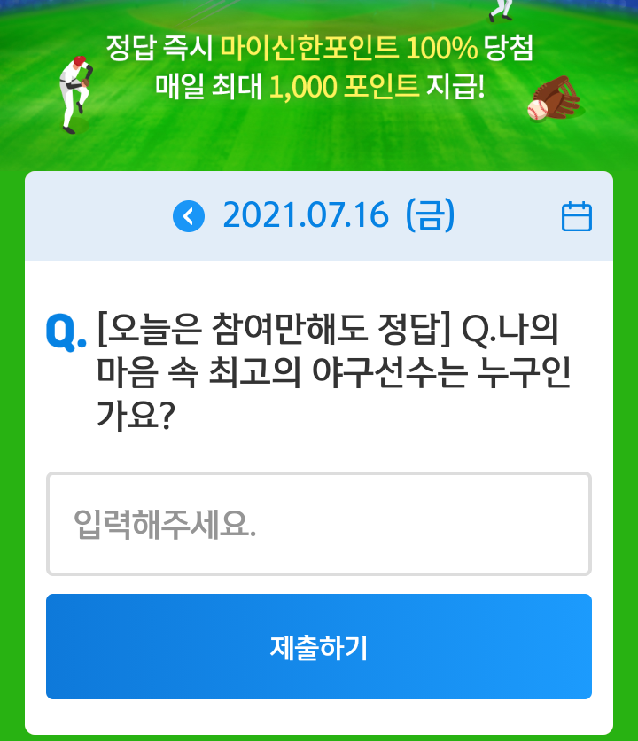 매일 야구상식 쏠퀴즈 풀고 마이신한포인트 최대 1000포인트 받아가세요.