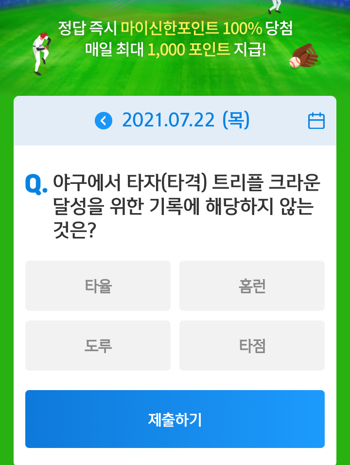 매일 야구상식 쏠퀴즈 풀고 마이신한포인트 최대 1000포인트 받아가세요.