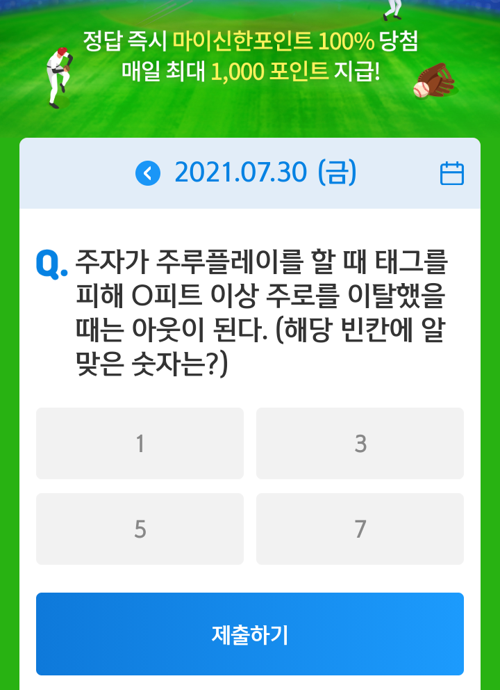 신한쏠, 야구상식 쏠퀴즈(21.07.30), 퀴즈정답, 주자가 주루플레이를 할때 테그를 피해 O피트 이상