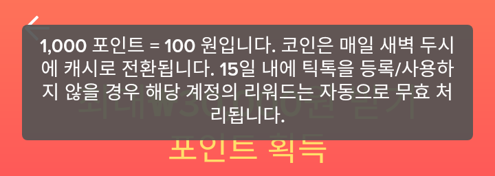 - 1000포인트=100원이다. 코인은 매일 새벽 두시에 캐시로 전환된다. 15일 내에 틱톡을 등록/사용하지 않을 경우 해당 계정의 리워드는 자동으로 무효 처리된다.