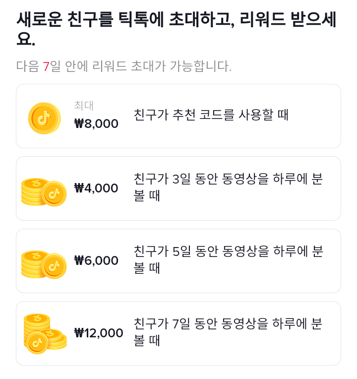 새로운 친구를 틱톡에 초대하면 추가 리워드가 지급된다.