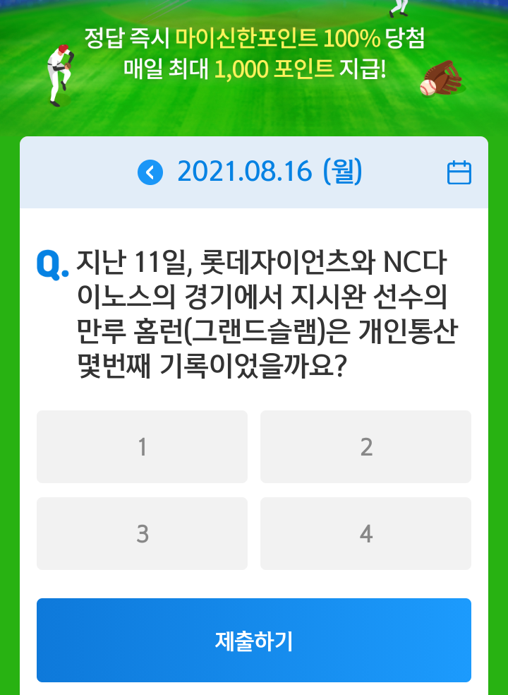 신한쏠, 야구상식 쏠퀴즈(21.08.16), 퀴즈정답, 롯데자이언츠와 NC다이노스의 경기에서 지시완 선수의 만루 홈런