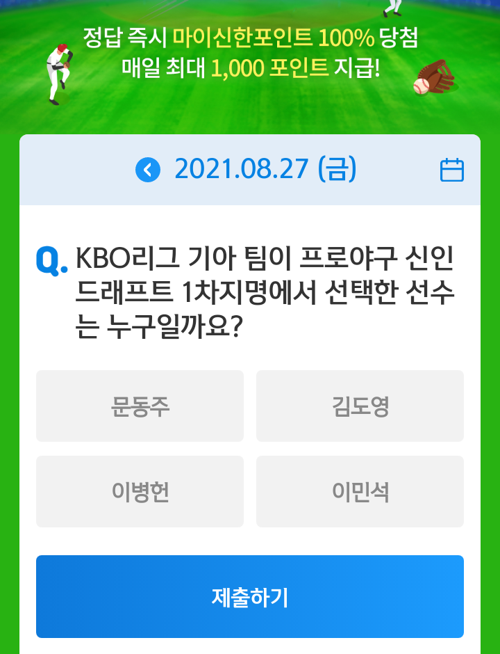 신한쏠, 야구상식 쏠퀴즈(21.08.27), 퀴즈정답, 기아 팀이 프로야구 신인 드래프트 1차지명에서 선택한 선수