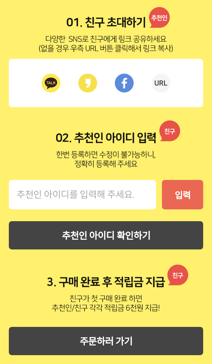 - 친구가 첫 주문 완료하면 친구도 나도 적립금 6천원 지급!