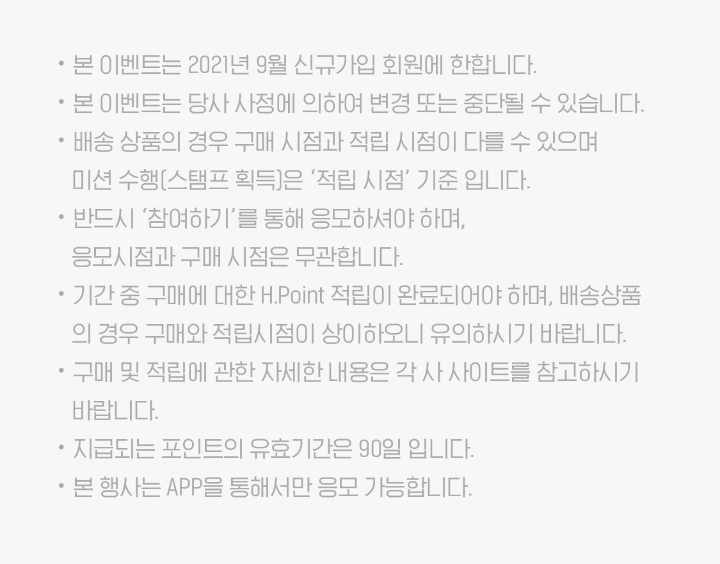 - 기간 중 구매에 대한 H.Point 적립이 완료되어야 하며, 배송상품의 경우 구매와 적립시점이 상이하다.