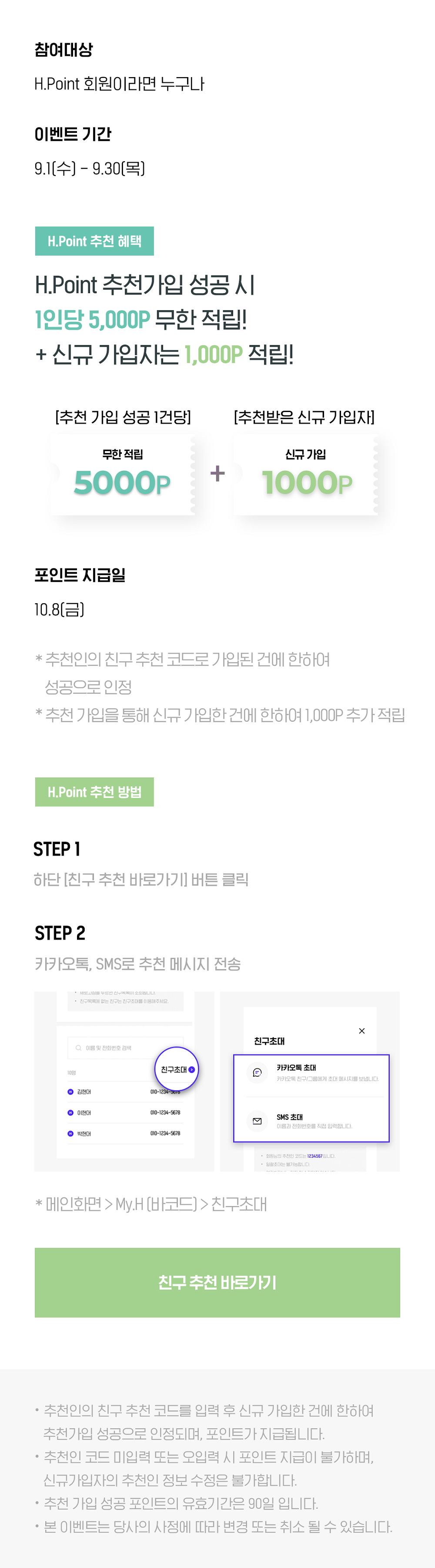 - H.Point 추천가입 성공 시 1인당 5000P 무한 적립! + 신규가입자는 1000P 적립!