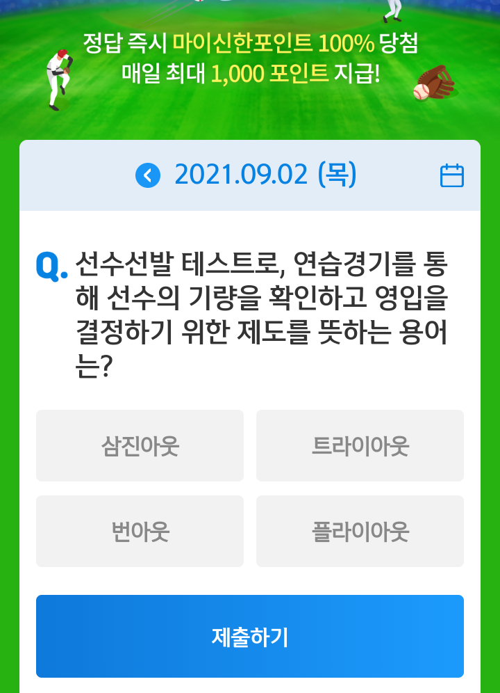 매일 야구상식 쏠퀴즈 풀고 마이신한포인트 최대 1000포인트 받아가세요.