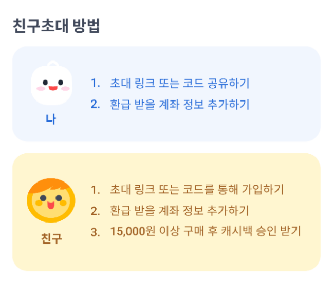 조건은 ① 친구의 초대 링크 또는 코드로 가입, ② 환급 받을 계과 정보 추가, ③ 15000원 이상 구매 후 캐시백 승인 받으면되고, 주문건 승인 완료는 보통 3개월 후에 완료된다. 주문건 승인이 완료되면 환급정보를 입력할 수 있다.
