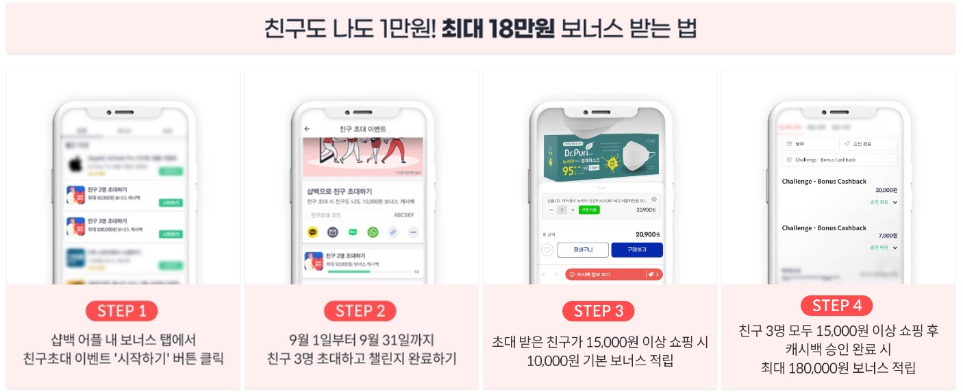 샵백(SHOPBACK) 코리아가 2021년 9월 1일 ~ 9월 30일까지 친구초대 이벤트를 진행하고 있다. 추천링크를 통해 샵백에 가입하면 친구도 나도 1만원 보너스가 캐시백되고, 이벤트 기간동안 챌린지를 완료하면 총 18만원의 보너스가 캐시백된다.