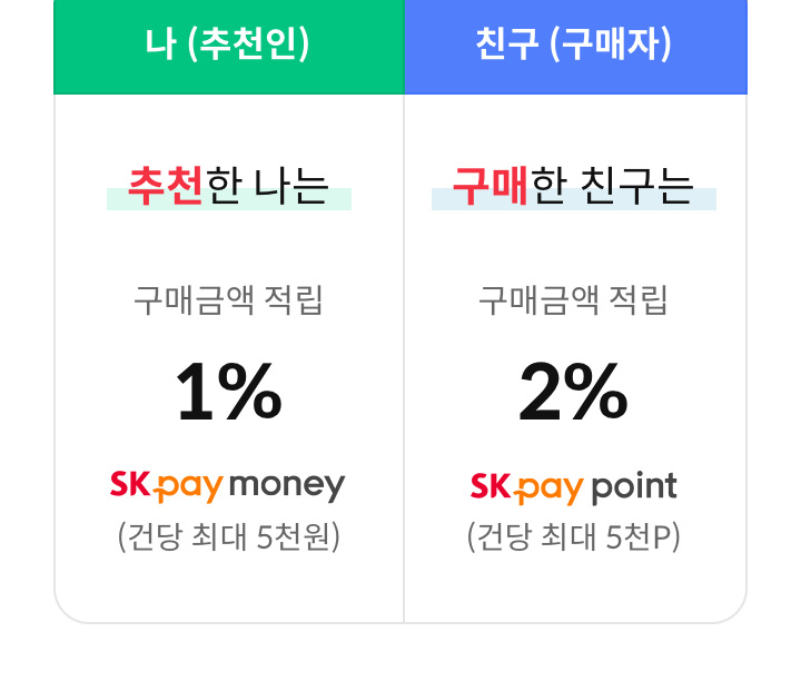 아마존 머니백은 아마존에서 쇼핑할때 친구의 추천코드를 입력하면 친구와 함께 적립 받게 된다. 추천한 나는 구매금액 1%, 구매한 친구는 구매금액 2%가 SK pay 머니 또는 포인트로 적립이 된다.(건당 최대 5천P 적립)