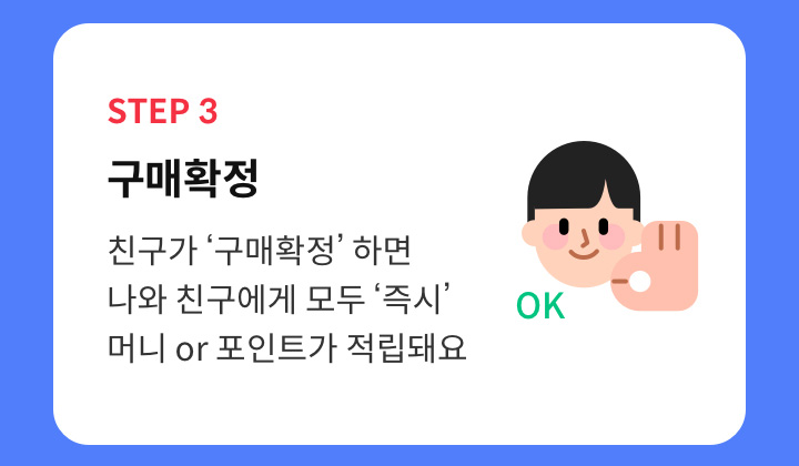 - 친구가 구매확정 하면 나와 친구에게 모두 즉시 머니 or 포인트가 적립된다.