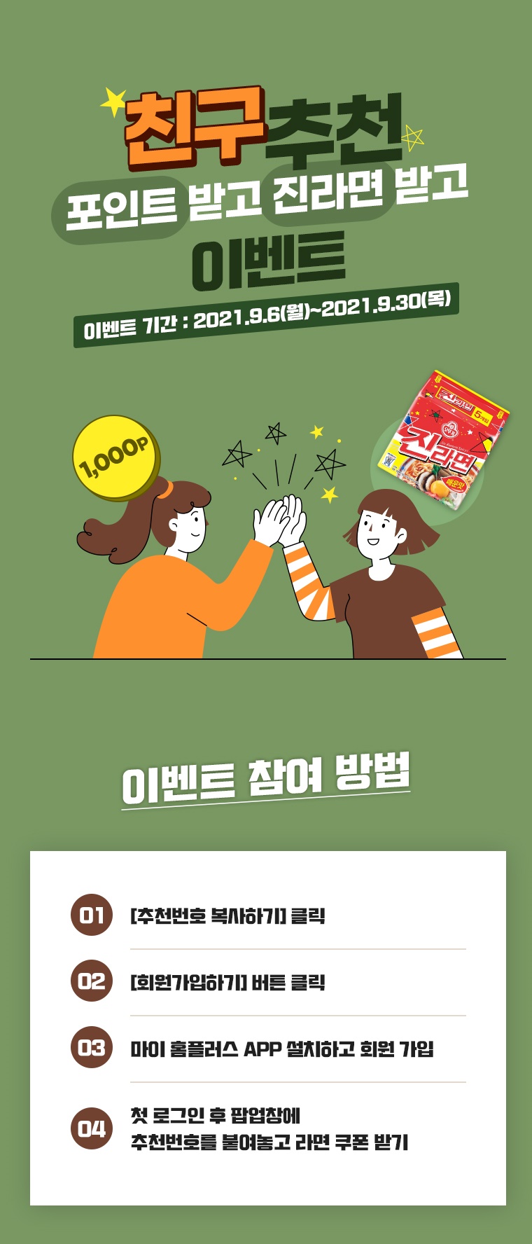 - 친구는 진라면(5입), 나는 1,000 포인트 적립(최대 4만원까지)