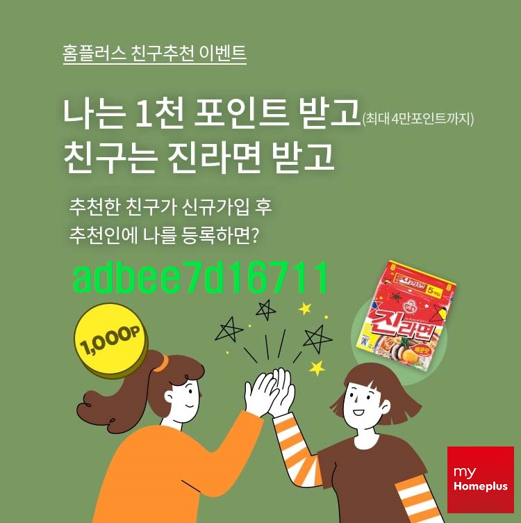 앱테크, 마이홈플러스 친구추천 이벤트(진라면 쿠폰) ( 추천번호 : adbee7d16711 )