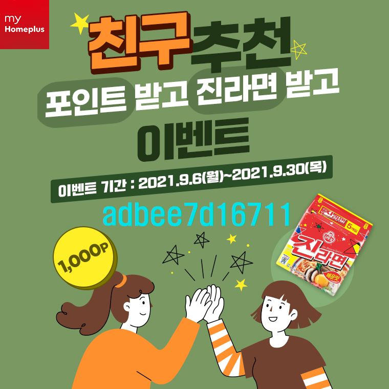 마이홈플러스(My homeplus) 친구추천 이벤트가 9.6~9.30 까지 진행중이다. 마이홈플러스 가입할때 추천번호( adbee7d16711 )를 입력하고 가입하면 진라면(5입) 쿠폰이 지급된다.