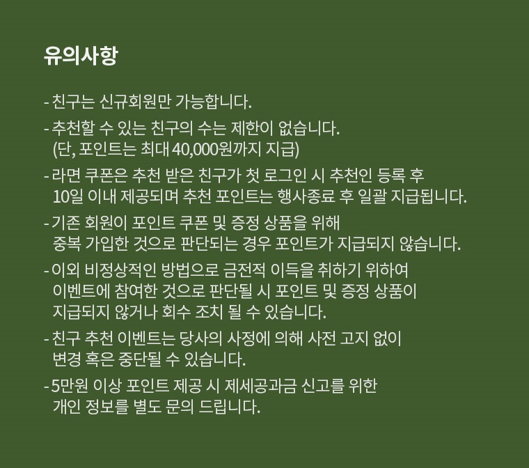 - 친구는 신규회원만 가능. 추천할 수 있는 친구의 수는 제한이 없다.(단, 포인트는 최대 40,000원까지 지급)