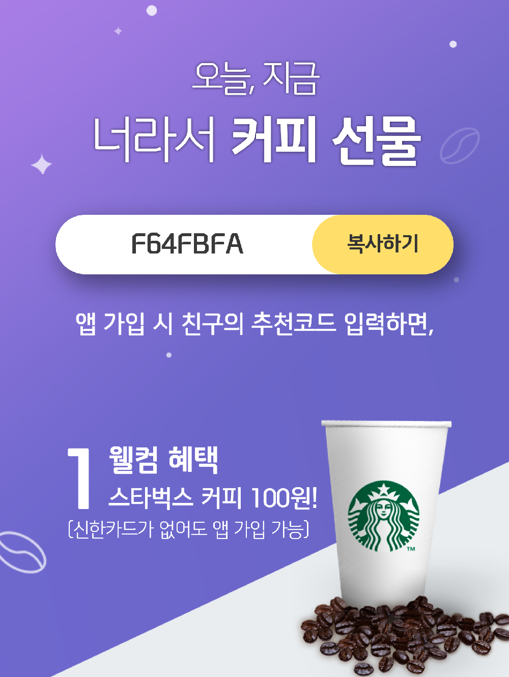 추천코드( F64FBFA ) 입력하여 신한페이판 가입하고 스타박스 아메리카노 커피 받아가세요~!