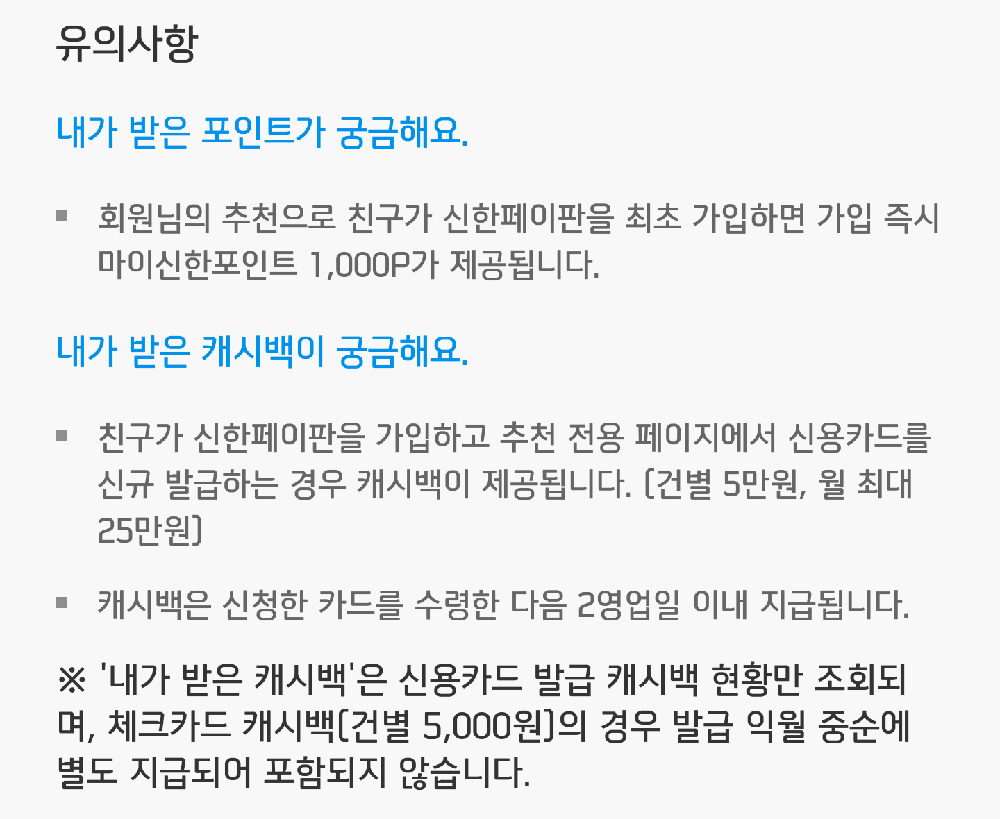 - 친구가 신한페이판을 가입하고 추천 전용 페이지에서 신용카드를 신규 발급하는 경우 캐시백이 제공된다.(건별 5만원, 월 최대 25만원)