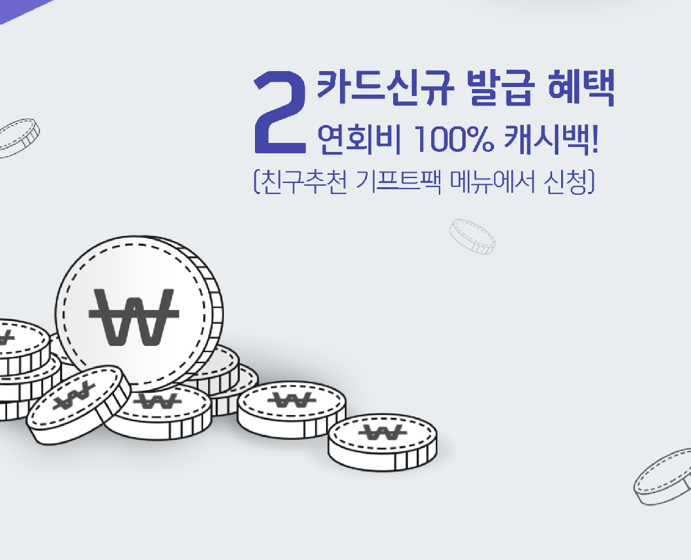 - 카드 신규발급시 연회비 100% 캐시백(친구추천 기프트팩 메뉴에서 신청)